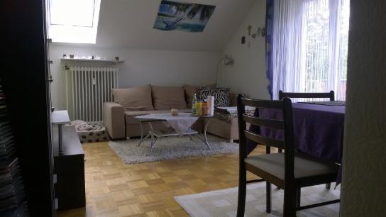 Das Wohn-/Esszimmer mit Parkett ist ausgestattet mit einer Schlafcouch, einem Couchtisch, einer Wohnschrankwand mit TV und portablem Radio-/CD-MP3-Recorder sowie einem Esstisch mit Bank und 3 Stühlen. Außer dem Dachfenster geben eine doppelflügige Balkontür (kleiner franz. Balkon) und ein weiteres kleineres Fenster genügend Tageslicht in den Wohnraum.