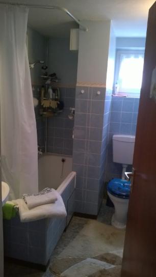 Das Bad besteht aus einer Badewanne, Waschbecken mit Spiegelschrank und WC. Es ist gefliest und hat ein kleines Tageslichtfenster.